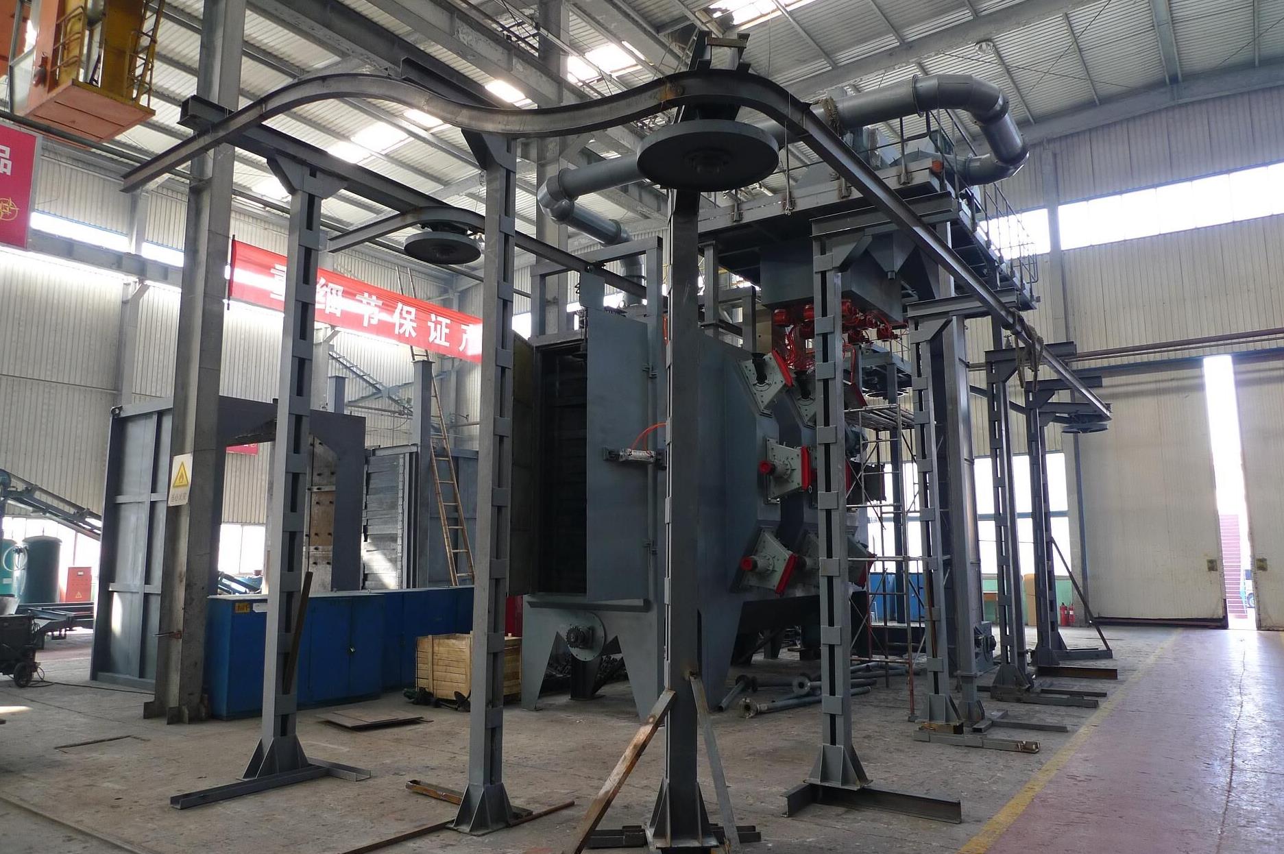 剛剛將一臺發(fā)往上海的懸鏈通過式拋丸機安裝完畢!大喜!江蘇鹽城拋丸機公司Q47懸鏈通過式拋丸機采用步進方式對工件進行清理,工件隨吊鏈步進運行,使工件在加卸料以及拋丸區(qū)分別處于停止?fàn)顟B(tài),實現(xiàn)定點裝卸和定點拋丸工序。可提高彈丸利用率和生產(chǎn)效率,適應(yīng)于批量生產(chǎn)的鑄件、鍛件、鋼結(jié)構(gòu)的表面清理,對表面及內(nèi)腔較復(fù)雜的工件,如發(fā)動機缸體蓋、電機殼體等清理效果尤佳。該拋丸機具體工作過程如下:裝零件→步進→關(guān)門→拋丸清理→開門→步進→卸零件→裝零件